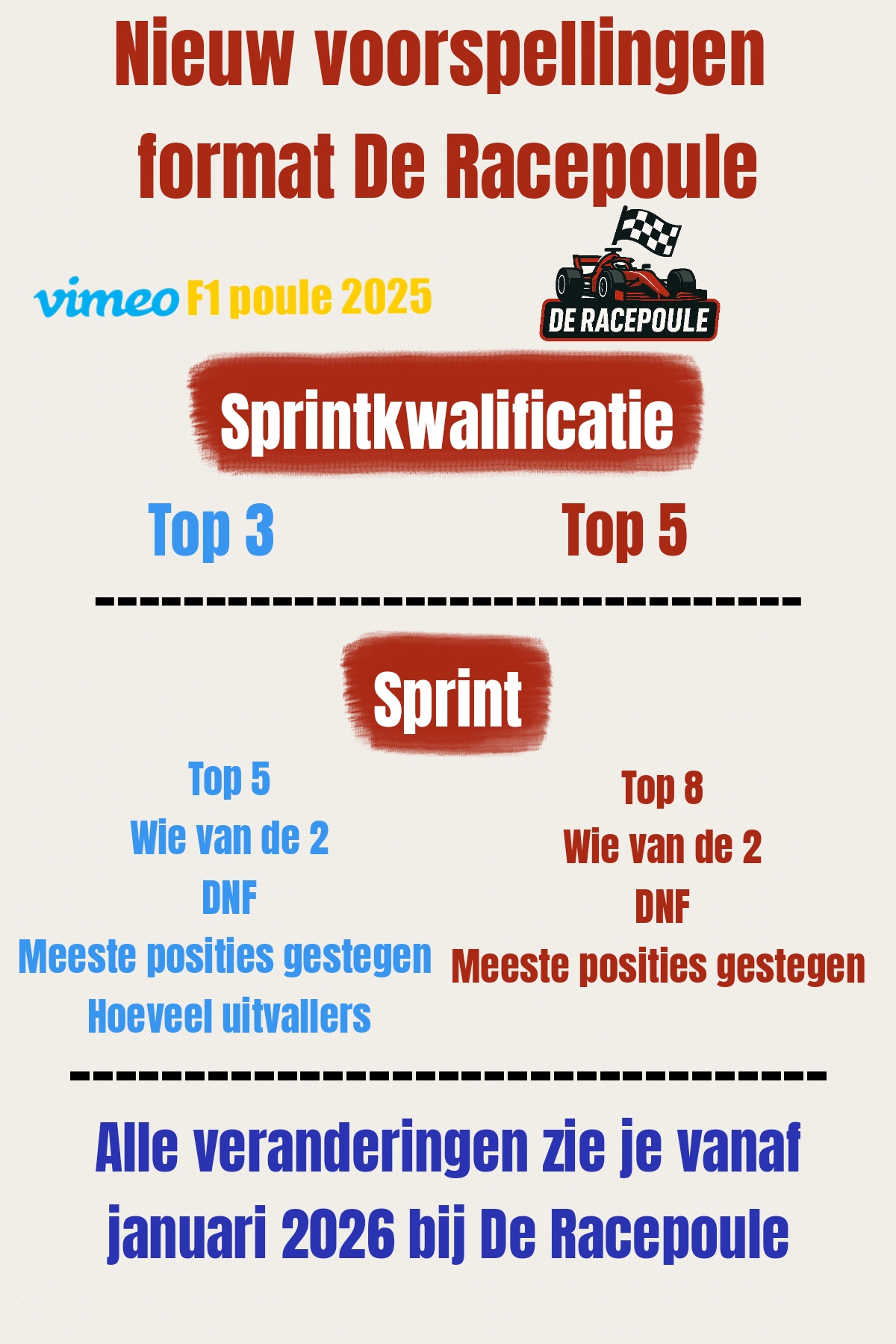 Na 3 jaar krijgen de sprintkwalificatie en sprintrace een nieuw format bij de Racepoule vanaf 2026. Deze veranderingen hebben ook impact op de puntentelling, bij de sprintkwalificatie en sprintrace gaat een andere nieuwe puntentelling gelden. Hoe deze puntentelling er precies uit gaat zien wordt in januari bekend als de volledige puntentelling bekend is. Kijk op de afbeelding naar de veranderingen.